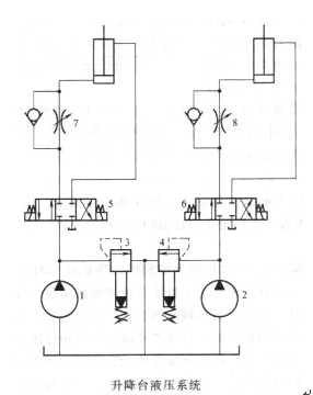 某工廠生產(chǎn)的設(shè)備安裝升降臺液壓系統(tǒng)如下圖所示,用雙泵雙回路控制兩個頂升液壓油缸,實現(xiàn)雙缸同時動作或單缸動作。兩個同路對應(yīng)的液壓元件規(guī)格相同,管路通徑相同。
